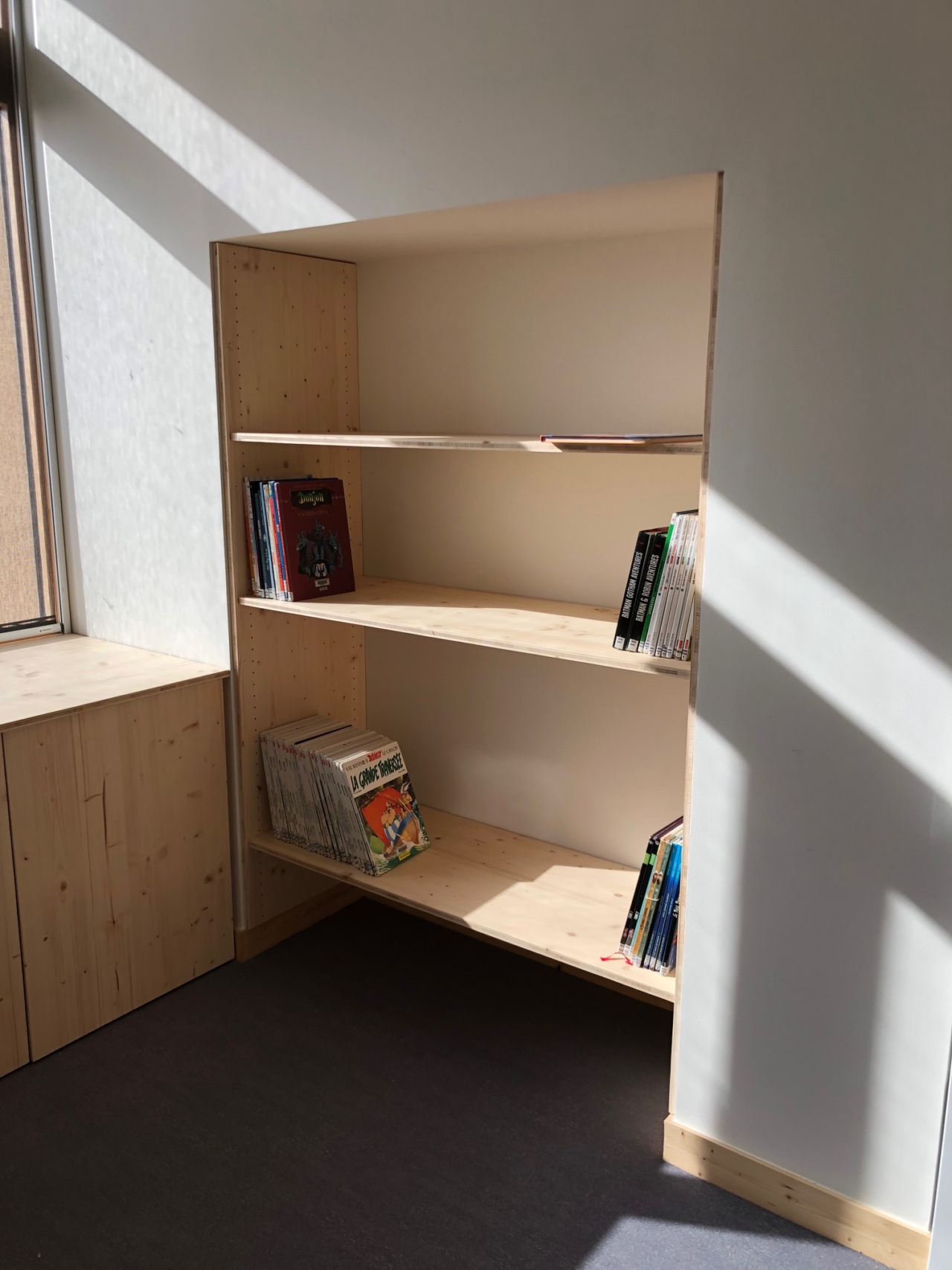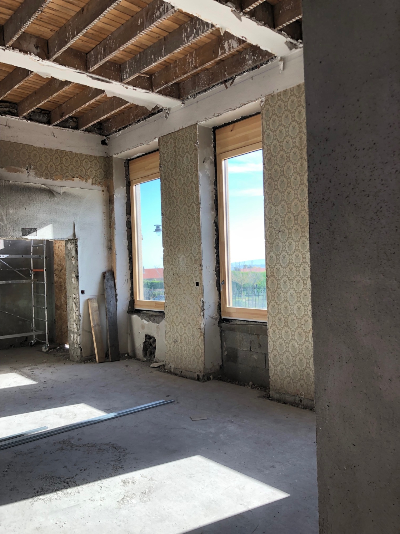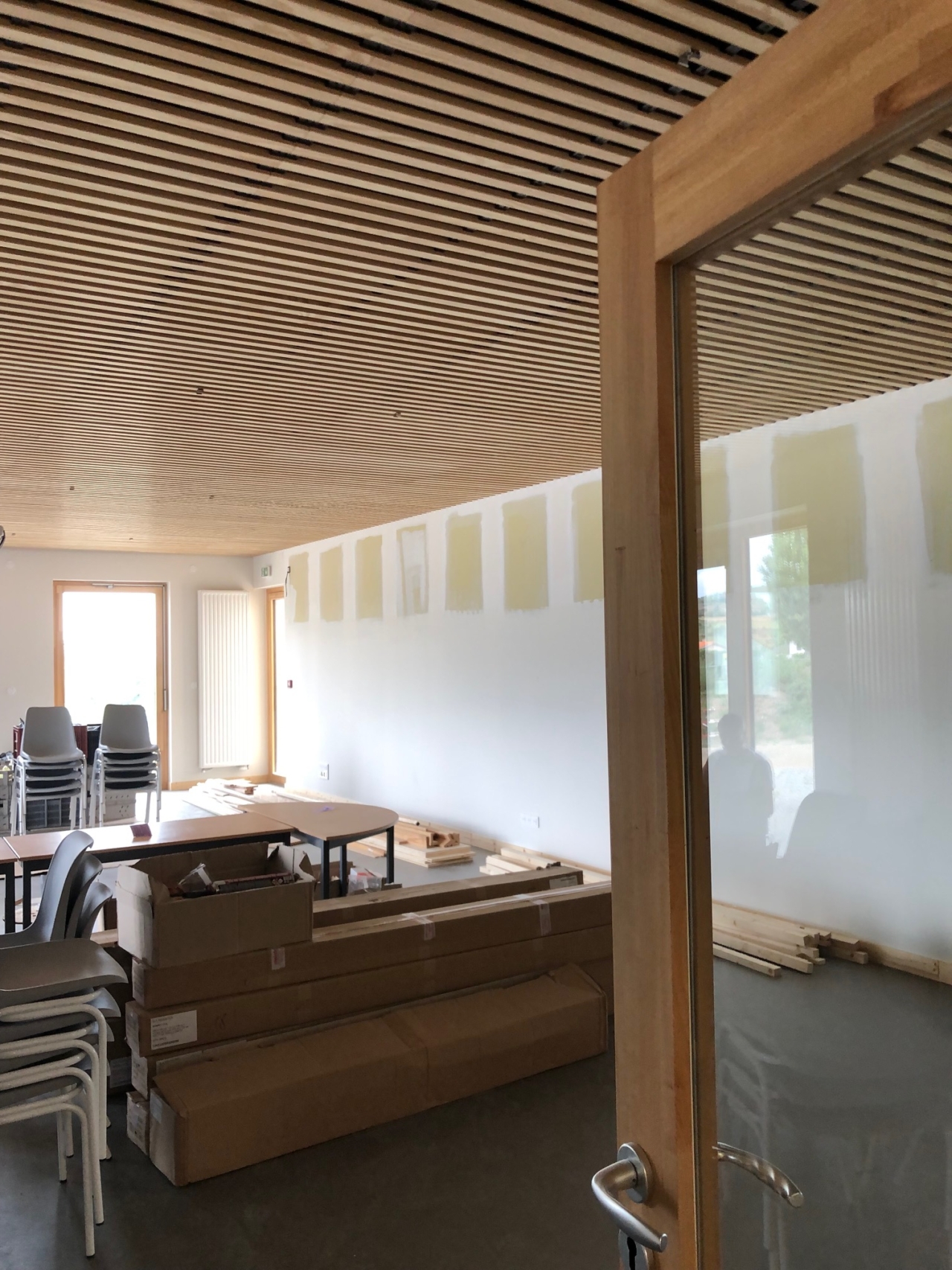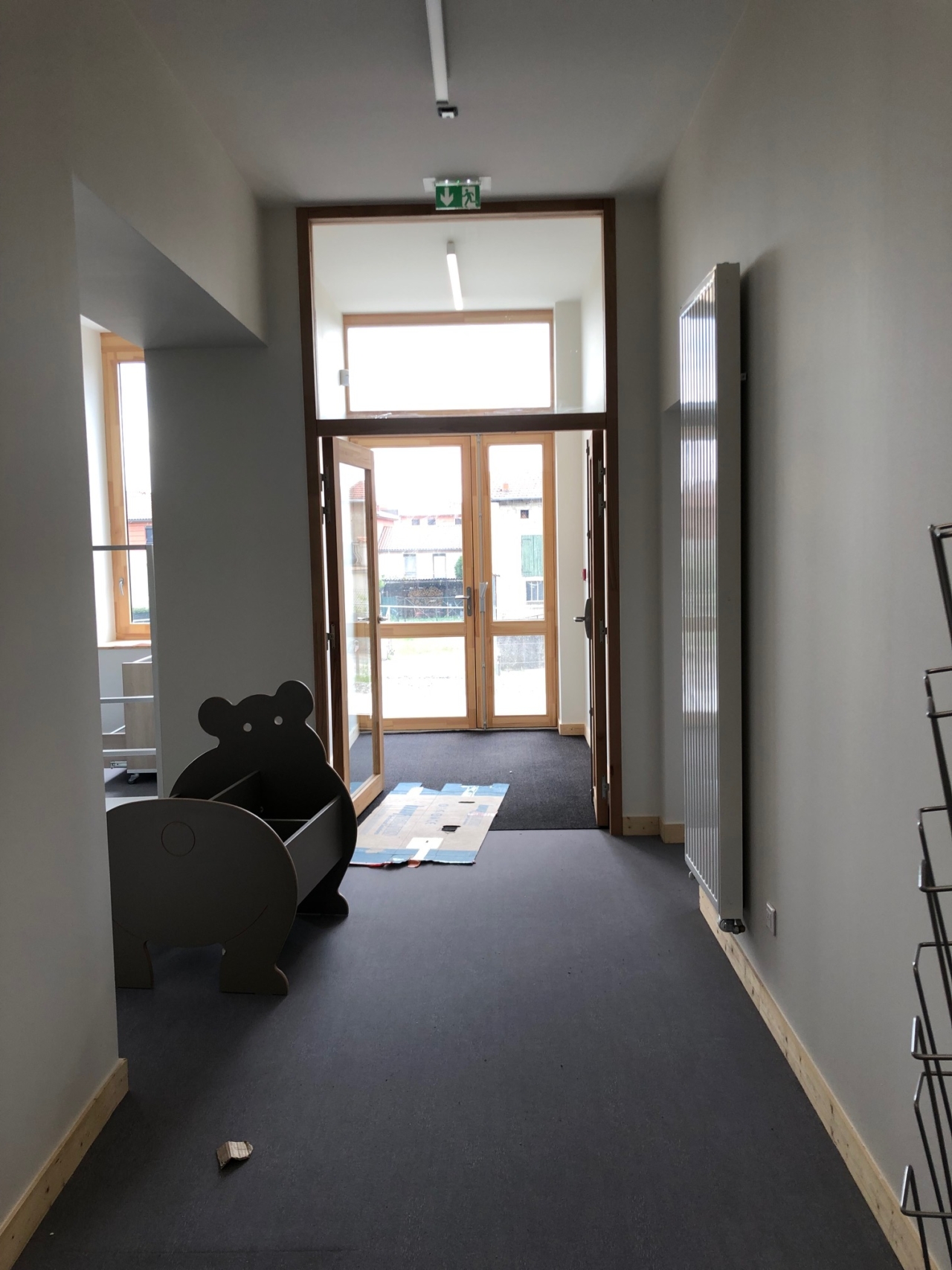 La réhabilitation du bâtiment est très lourde. Le plan initial, pensé pour des petites classes doit être largement ouvert. Il en résulte de large ouverture des murs porteurs. A l’étage du bâtiment se trouve des salles de classes de l’école élémentaire. La séparation phonique et le confort d’été étaient deux axes forts du projet.