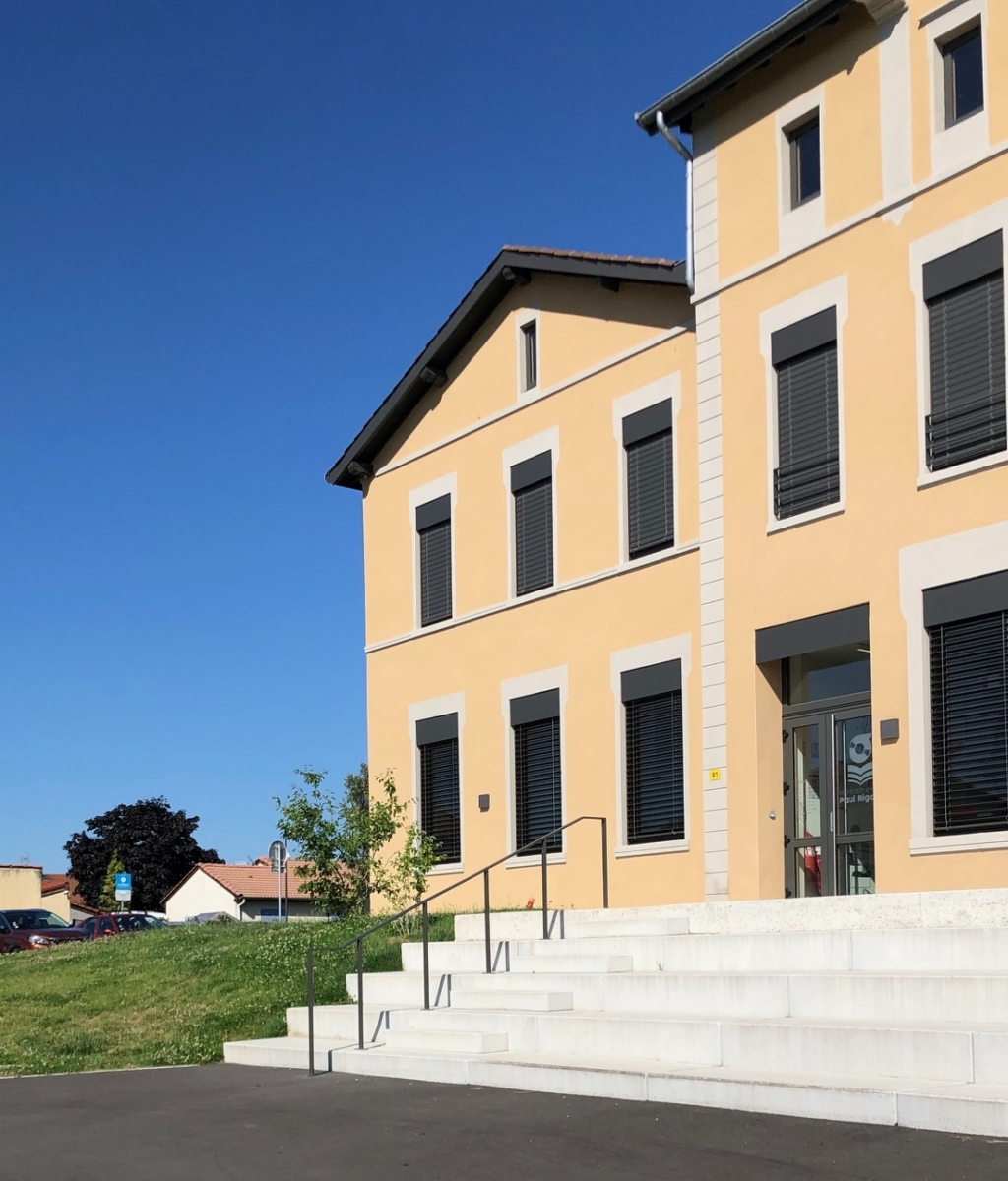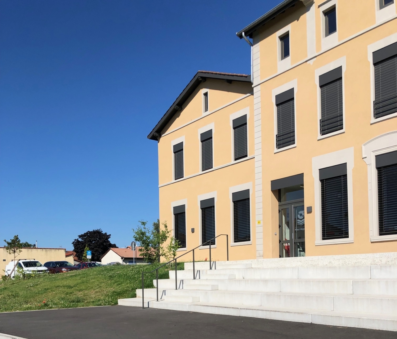 La réhabilitation du bâtiment est très lourde. Le plan initial, pensé pour des petites classes doit être largement ouvert. Il en résulte de large ouverture des murs porteurs. A l’étage du bâtiment se trouve des salles de classes de l’école élémentaire. La séparation phonique et le confort d’été étaient deux axes forts du projet.